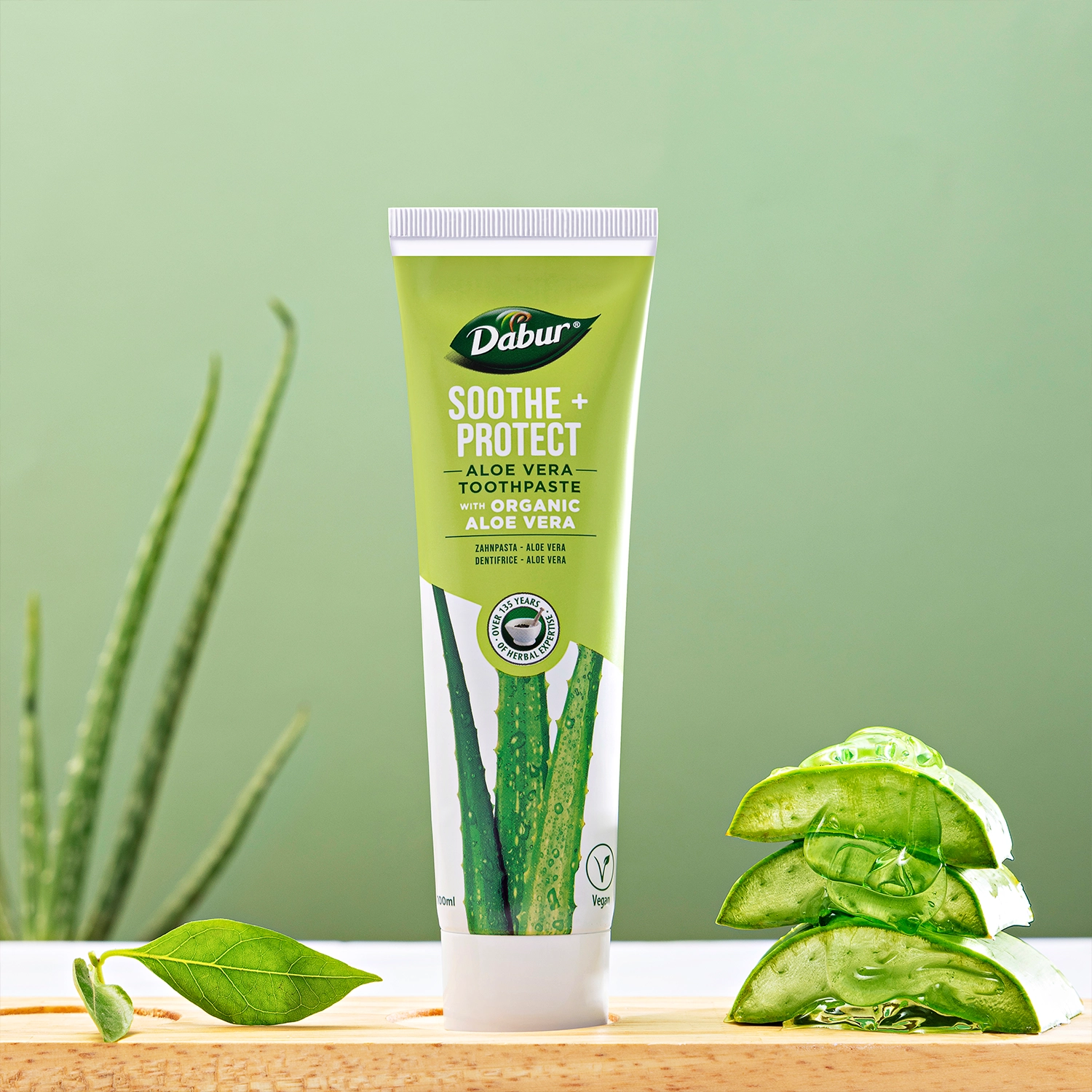 Натуралната паста за зъби Dabur Soothe and Protect с органично алое е уникална комбинация от най-доброто от природата – мощна смес от съставки като алое вера, Miswak и масло от чаено дърво. Органичното Алое вера е добре познато със своето природно успокояващо действие при проблеми с венците. Dabur Aloe Vera с органично алое помага за облекчаване на възпалени венци, предпазва зъбите от кариеси и поддържа зъбите и венците здрави и силни