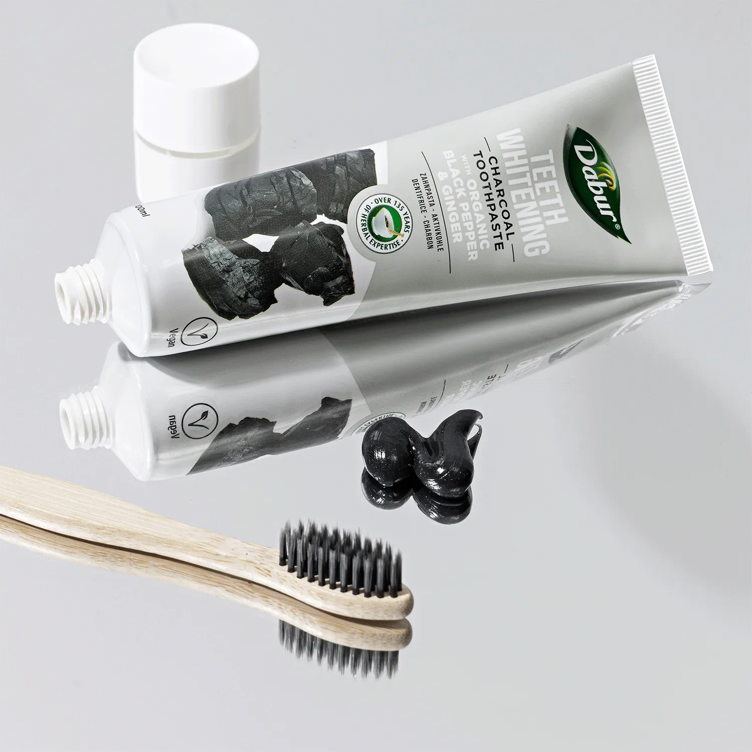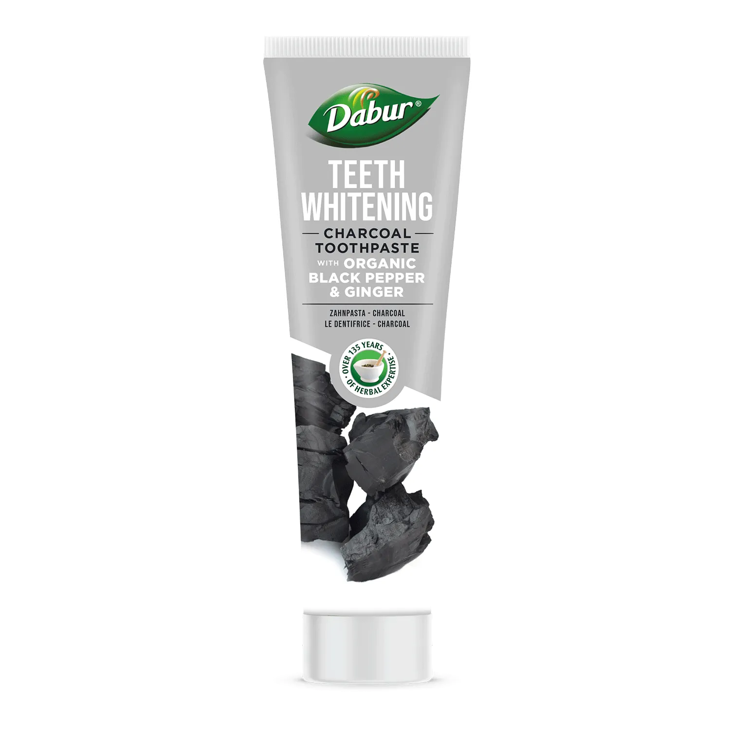 Натуралната паста за зъби Dabur Teeth Whitening с органичен черен пипер, дълъг пипер, джинджифил и активен въглен възстановява естествената белота на зъбите. Активният въглен има дълга и доказана история като мощна и ефективна съставка в грижата за устната кухина. Благодарение на своите естествени свързващи свойства, при миене на зъбите той се прикрепя към упоритите петна по емайла и помага за тяхното отстраняване. Екстрактите от пипер и джинджифил осигуряват по-добро кръвообращение във венците, както и противовъзпалително и антибактериално действие. Dabur Charcoal с органичен черен пипер и джинджифил използва силата на активния въглен, за да премахне петната и да Ви подари ослепително бяла усмивка.