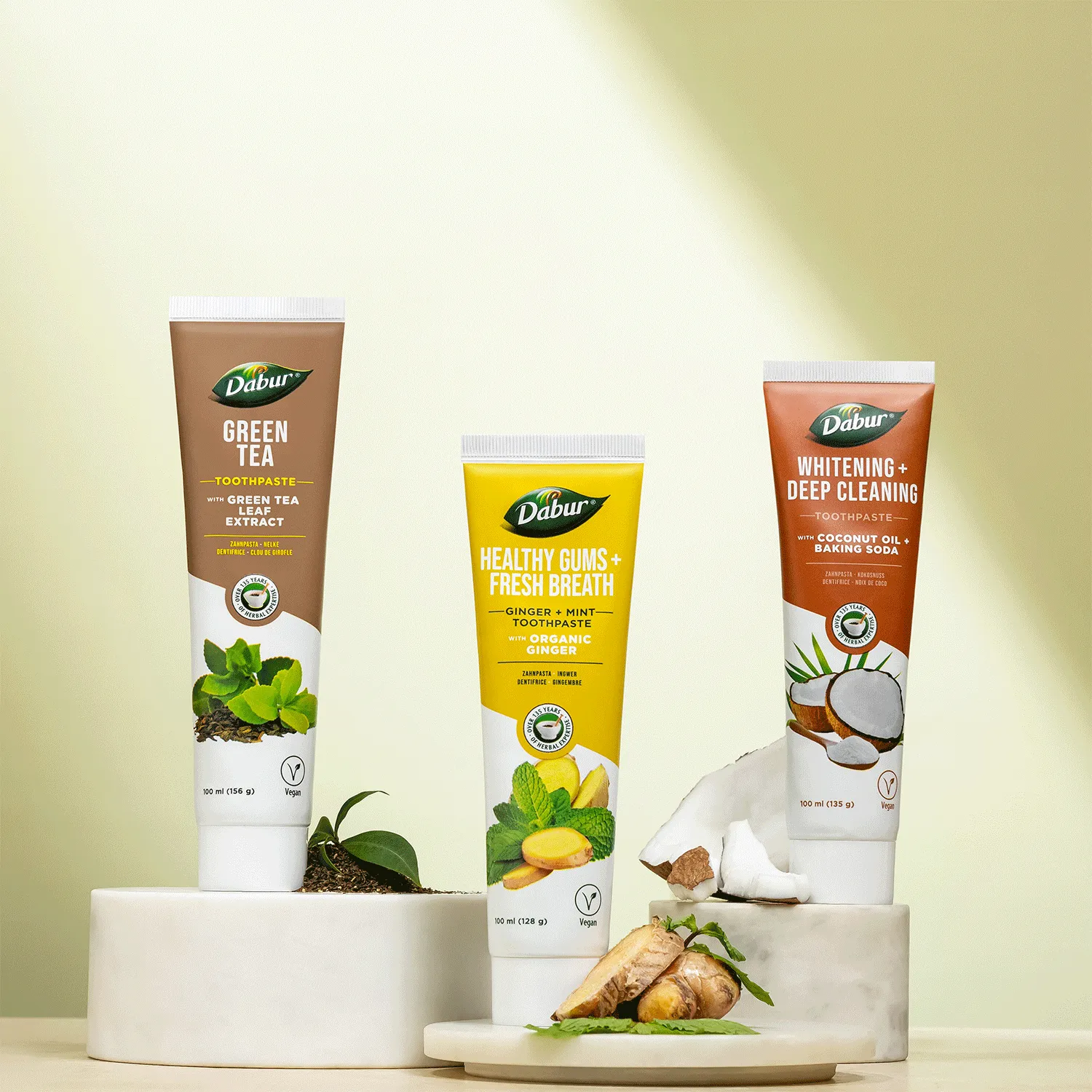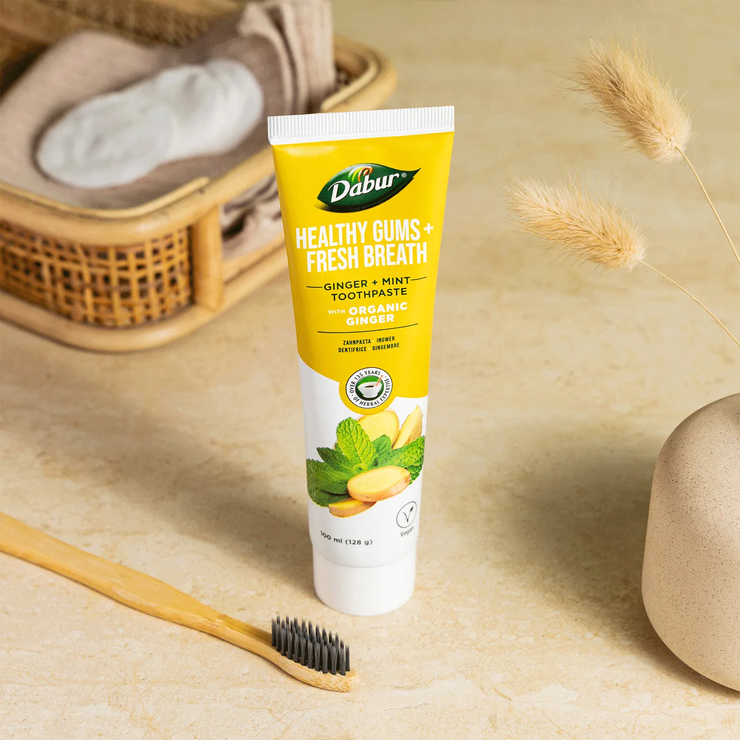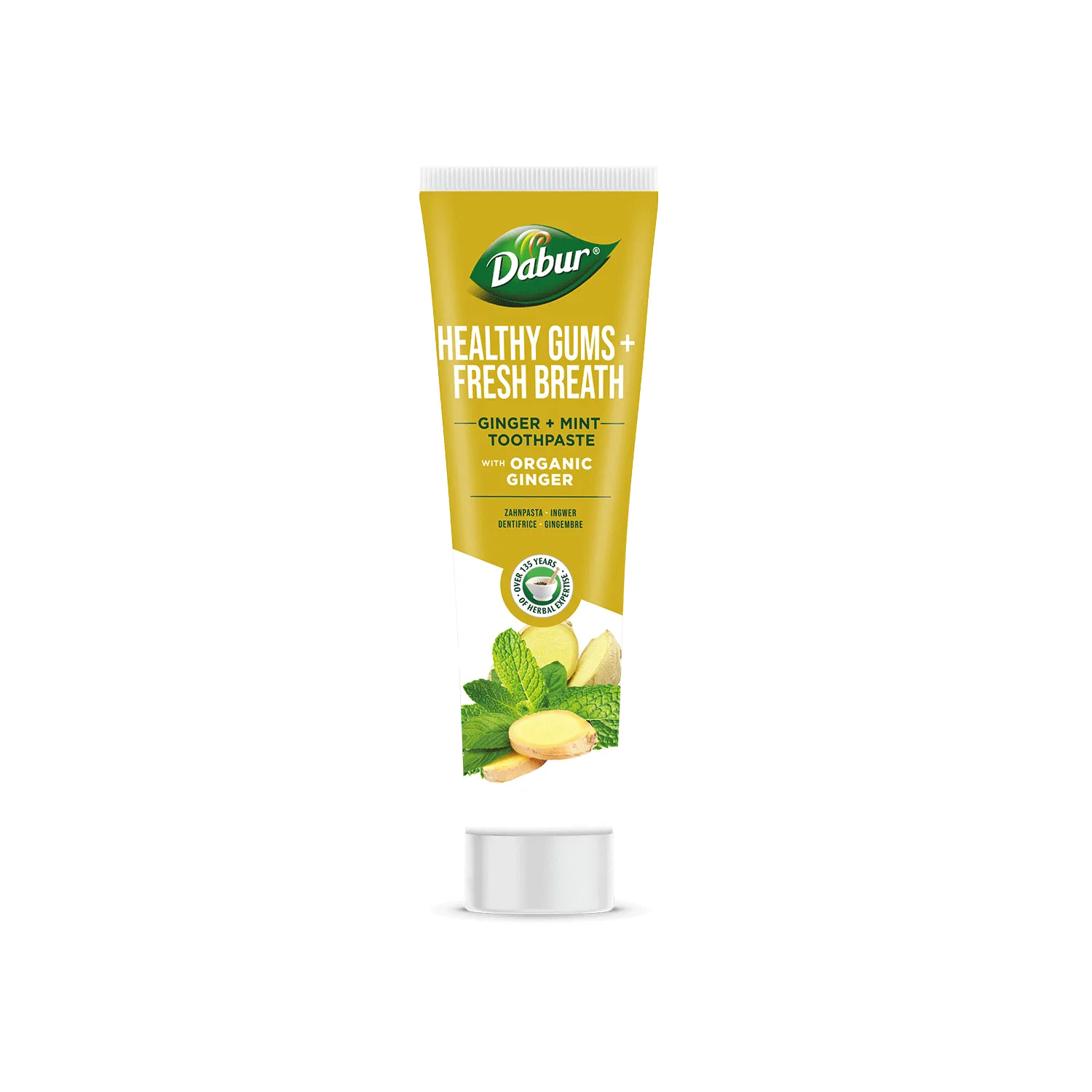 Натуралната паста за зъби Dabur Healthy gums + Fresh breath прави истинска магия и осигурява цялостна грижа за устната кухина. Създадена от 100% органичен джинджифил и мента, тази паста почиства дълбоко зъбите, предпазва от кариеси, защитава венците и освежава дъха.