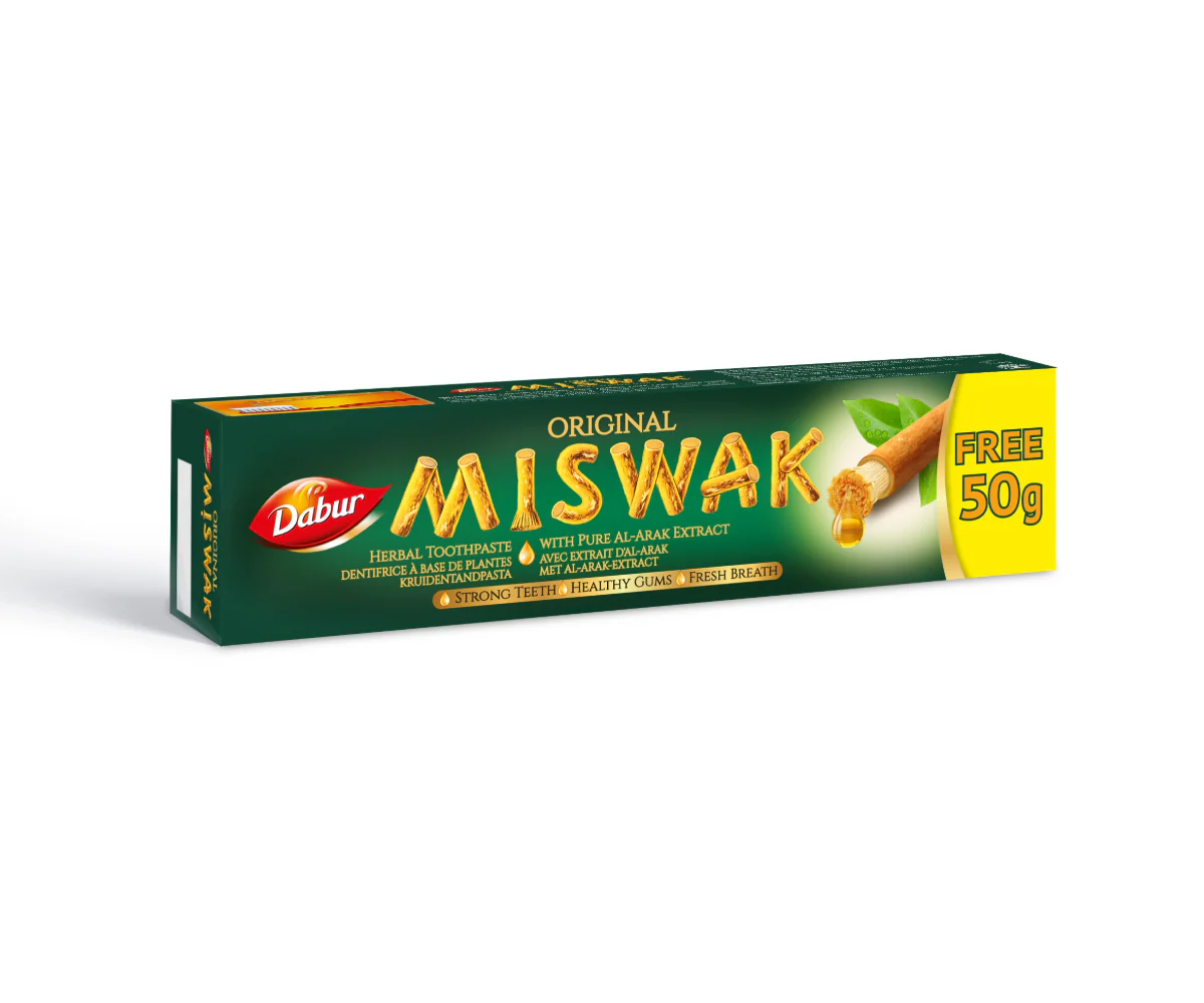 Dabur Miswak е паста за зъби с тайна от природата – екстракт от мисвак, използван от векове за здрава и сияйна усмивка. Нейната оригинална формула защитава венците, помага срещу натрупването на плака и Ви дарява със свеж дъх. Всяко измиване е като малък ритуал за чистота и увереност.