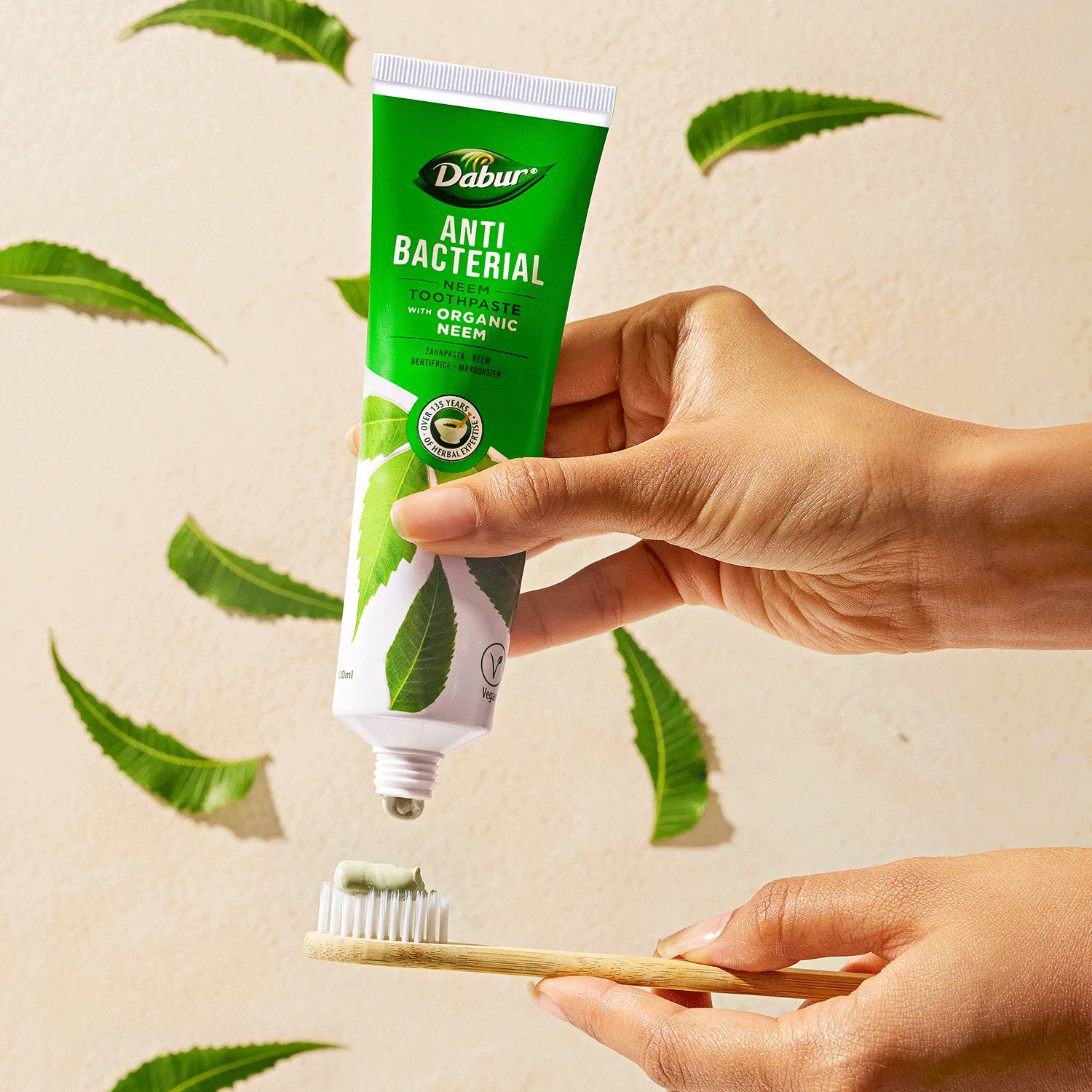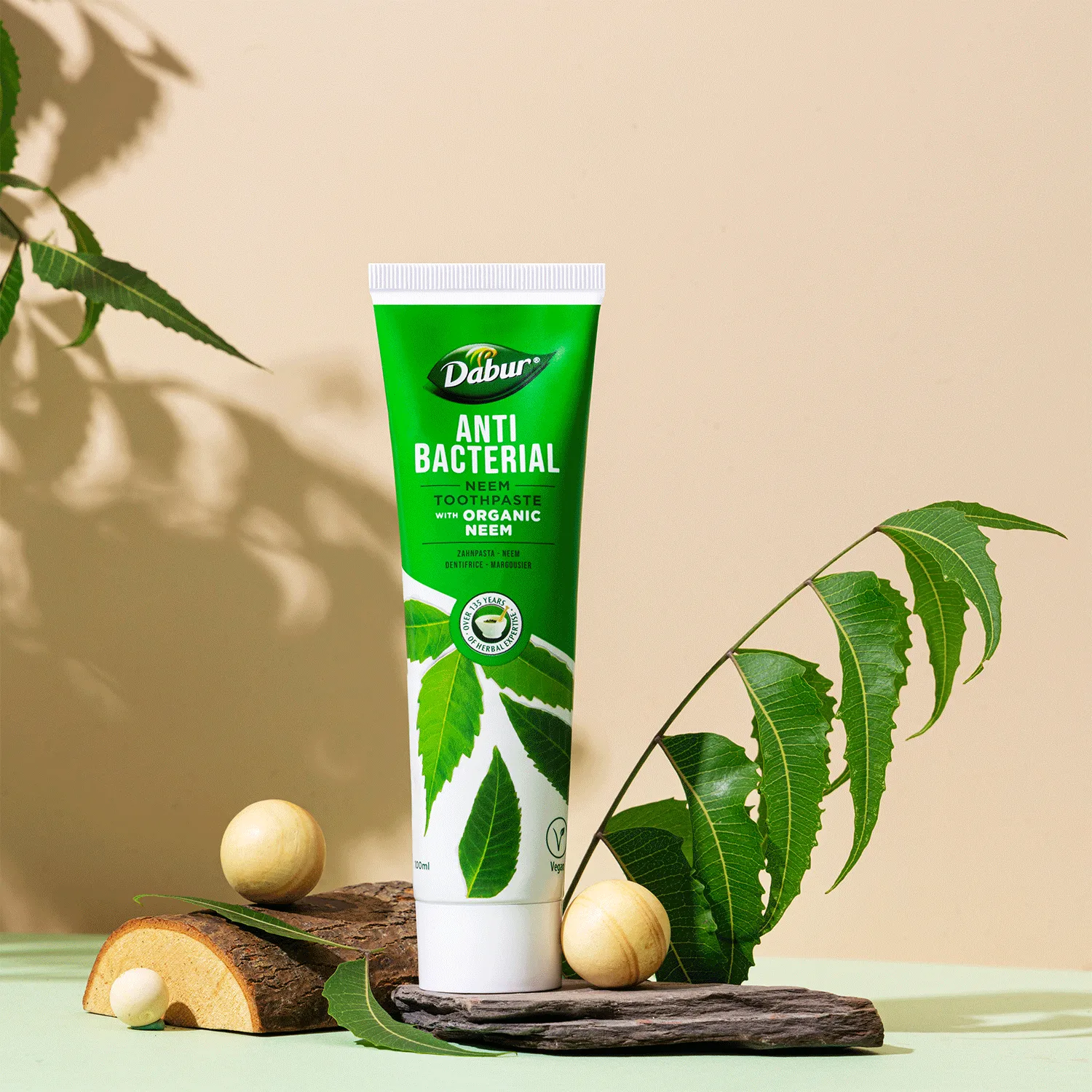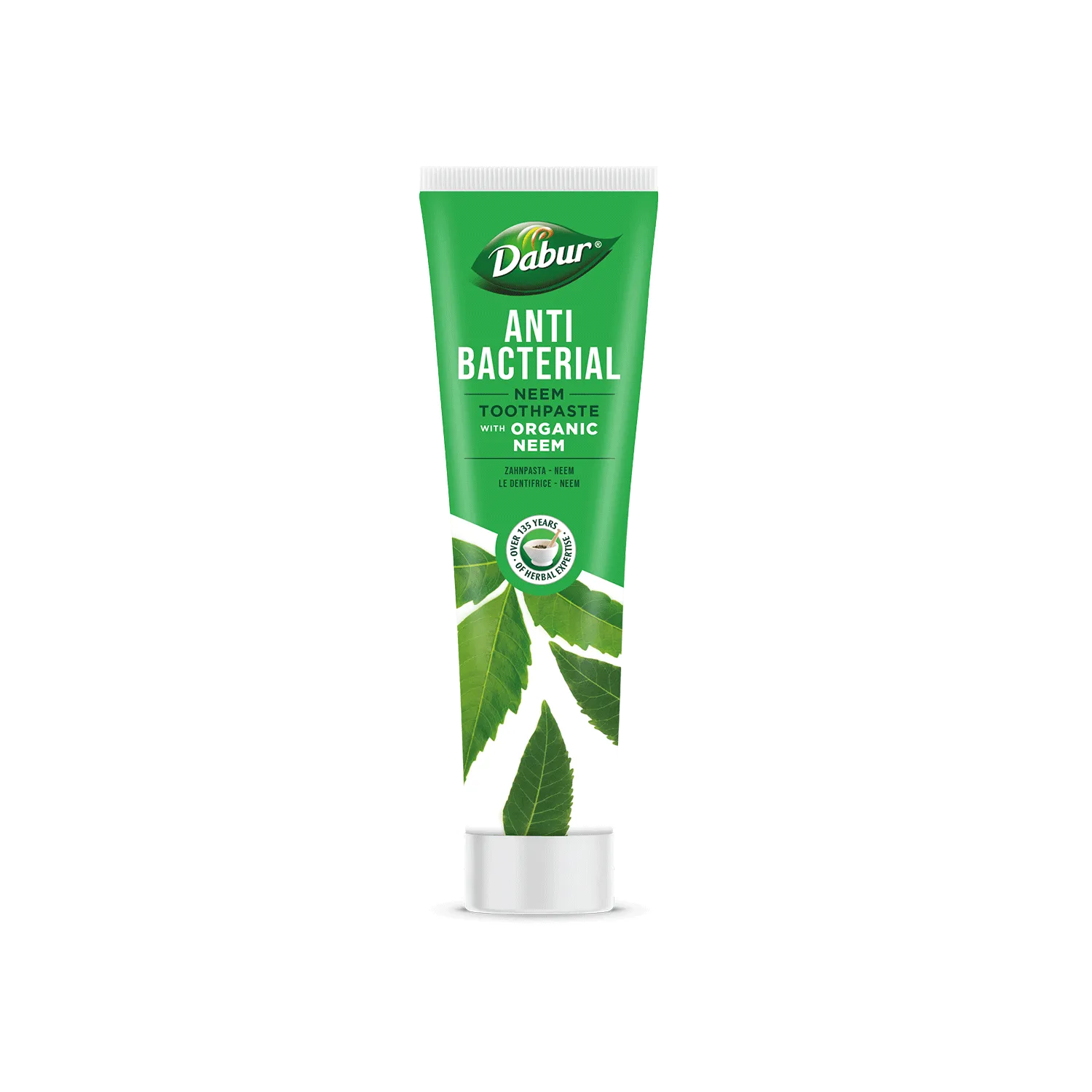 Натурална пастата за зъби Dabur Antibacterial с органичен нийм е уникална комбинация от мощни съставки като нийм, Bullet wood (Mimusops elengi) и кора от лотур. В азиатските страни ниймът е известен като „селската аптека“ заради своите антибактериални свойства и е широко признат като естествена защита срещу бактерии. Dabur Neem с органичен нийм предпазва зъбите от бактерии, причиняващи лош дъх, и подпомага здравето на венците и здравината на зъбите.